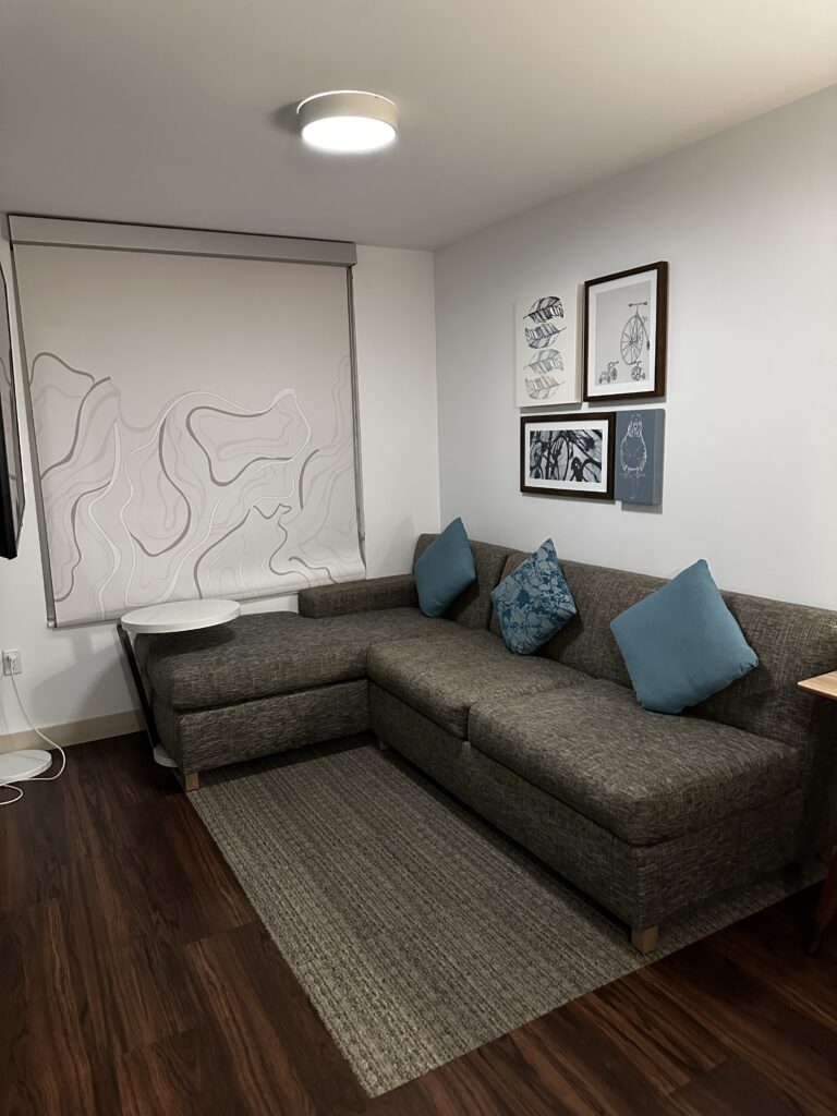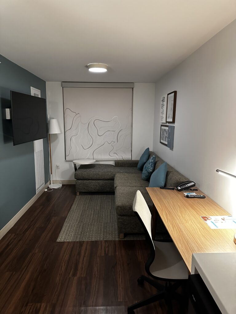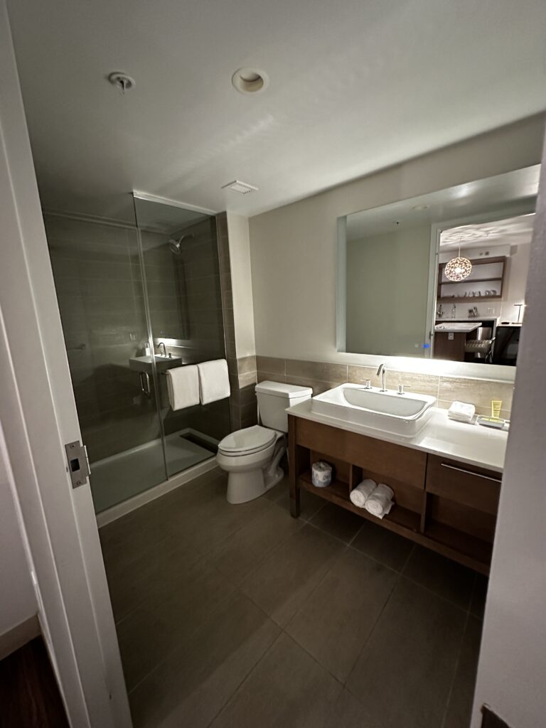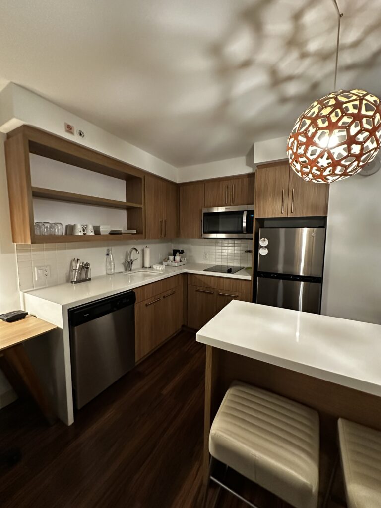 This particular suite featured a full kitchen, including a fridge, microwave, cooktop, and dishwasher. For families flying out early or arriving late, having access to simple snacks, drinks, or breakfast-in-the-room can make a big difference. The separate bedroom also allows for more restful sleep, especially if younger kids need a quiet space while parents relax in the living area.